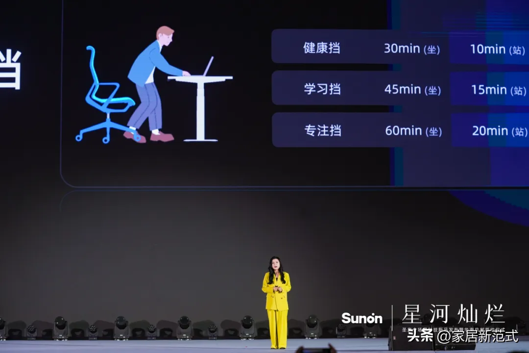 具体到微观上的人体健康,为了缓解久坐的压力,圣奥科技是国内最早推行“坐—站”办公方式的企业之一。早在2013年就推出I-work系列产品,实现主管桌的可升降。时隔11年,圣奥又升级出昂瑞总裁桌、UP7数字化工位两大新品,通过搭载毫米波雷达传感器,自动感应人体的动作、温度甚至静止状态下轻微的胸腔起伏,手指轻轻一动,桌面就能缓缓升起,还具备多维提醒功能,帮助使用者养成主动健康的好习惯。