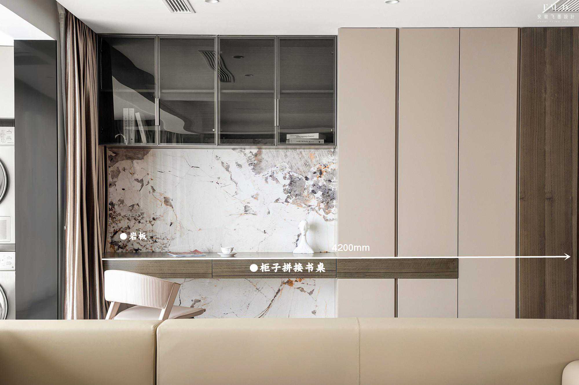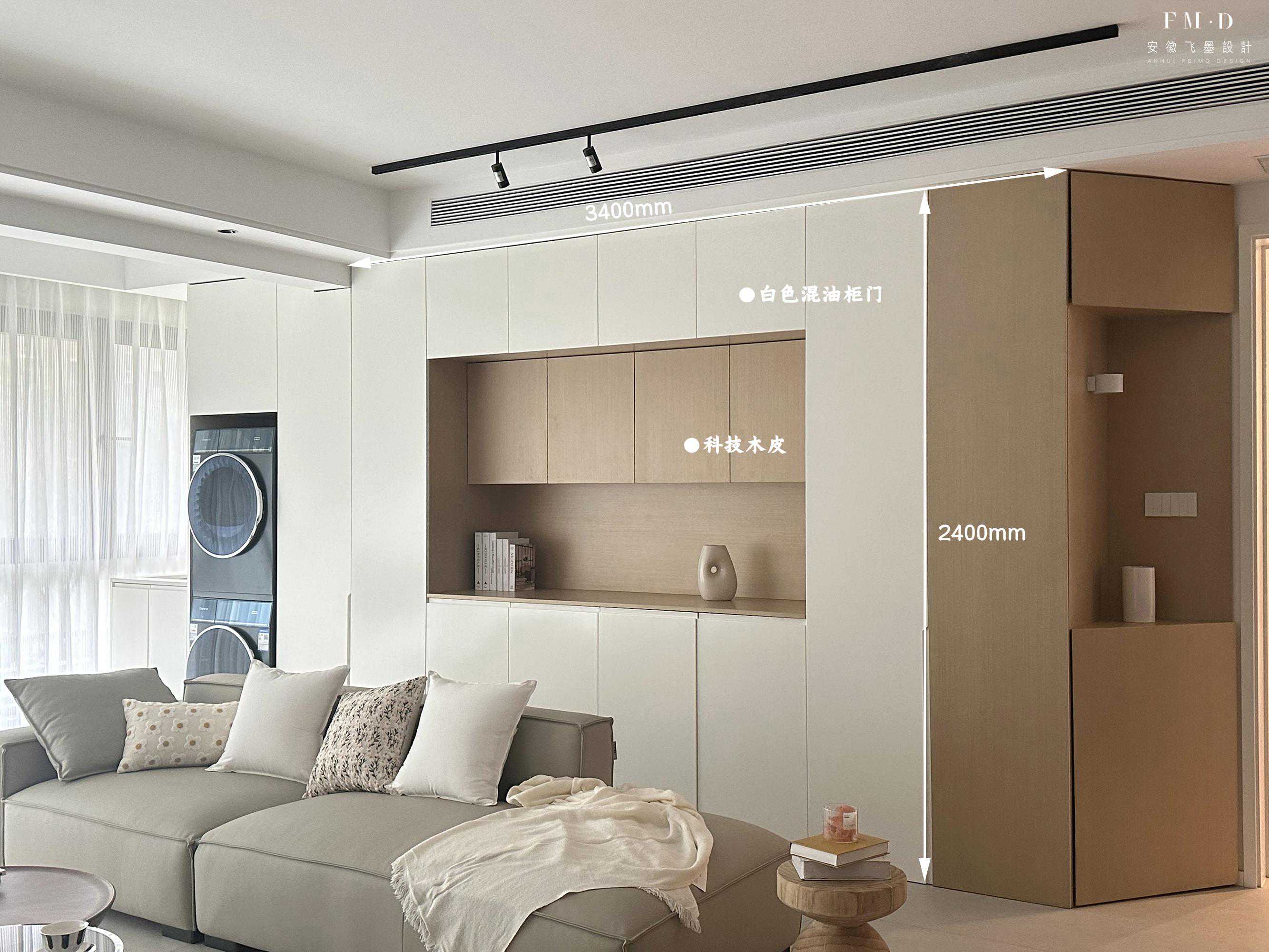 柜子长3.4米左右,高2.4米,中间预留50公分的高度,平时不管是置物,还是使用一些小电器都很方便。上面吊柜选择科技木皮材质,跟白色混油柜门形成层次感,加上内缩20公分,也不容易碰头。