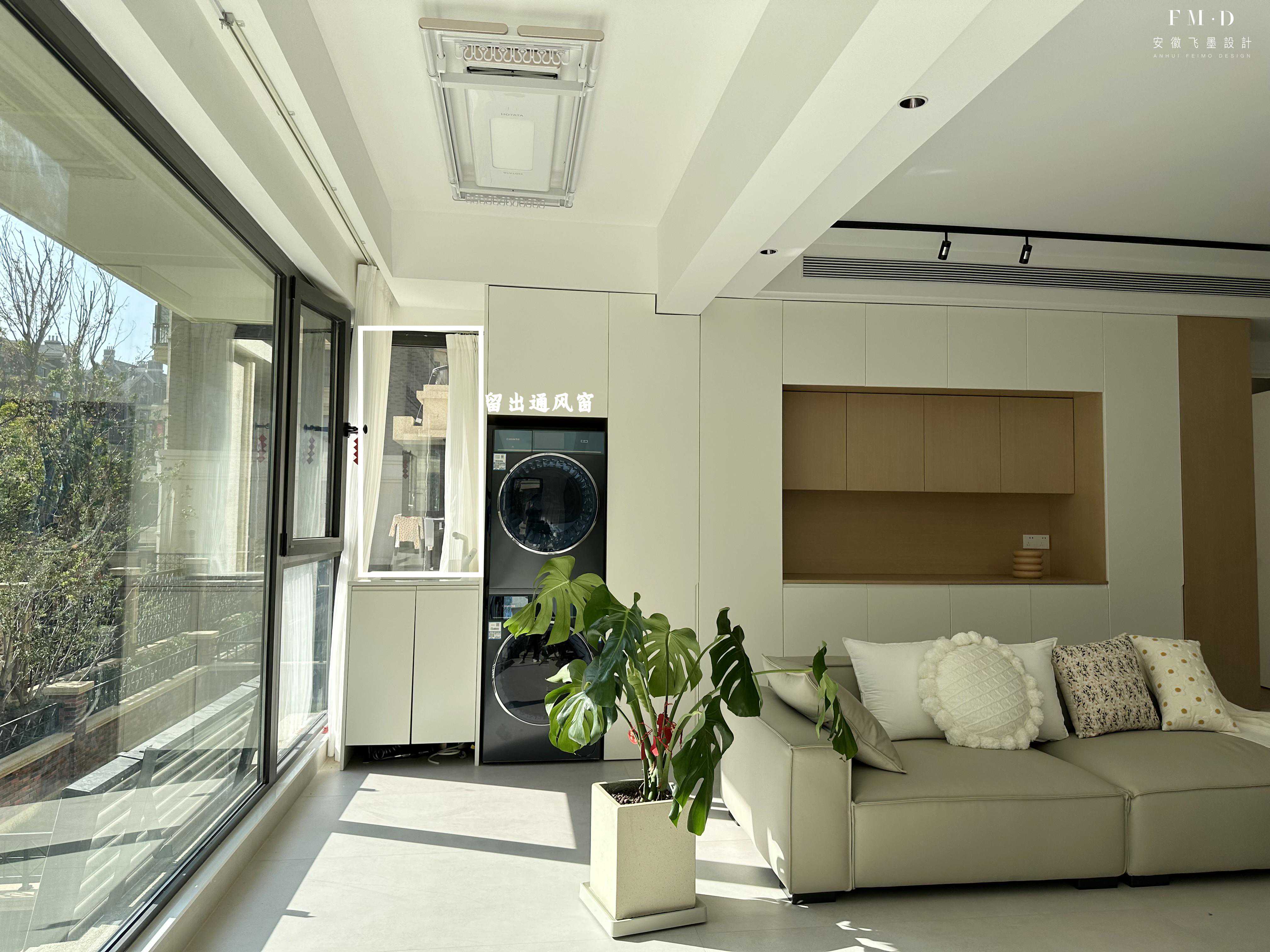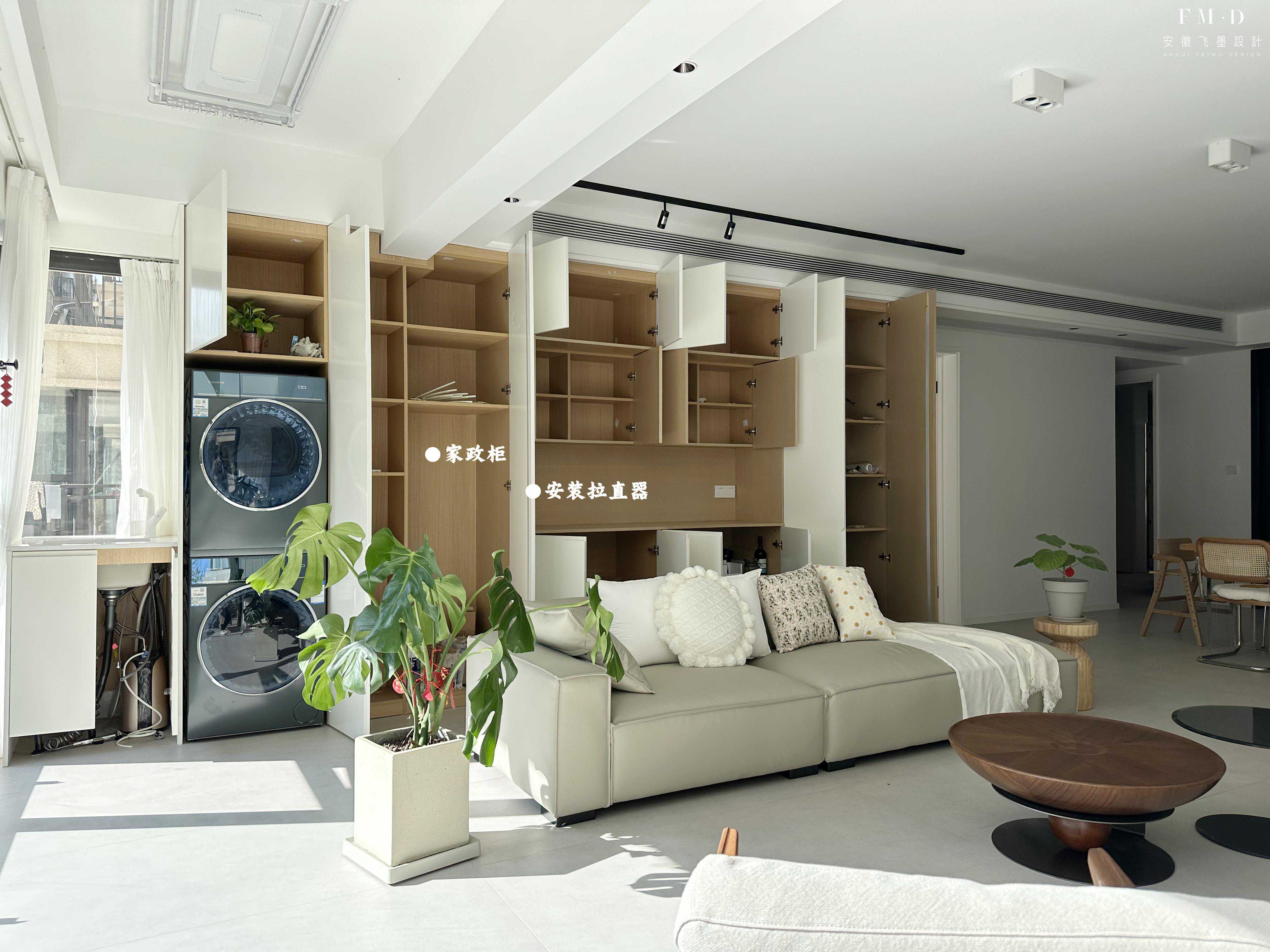为了让客厅显得更加敞亮,装修选择将阳台打通,再将客厅柜子直接延伸到阳台,洗衣机烘干机叠放嵌入在柜子里。注意周围留好缝隙,后期想要更换洗衣机都很方便,包括后期检修。