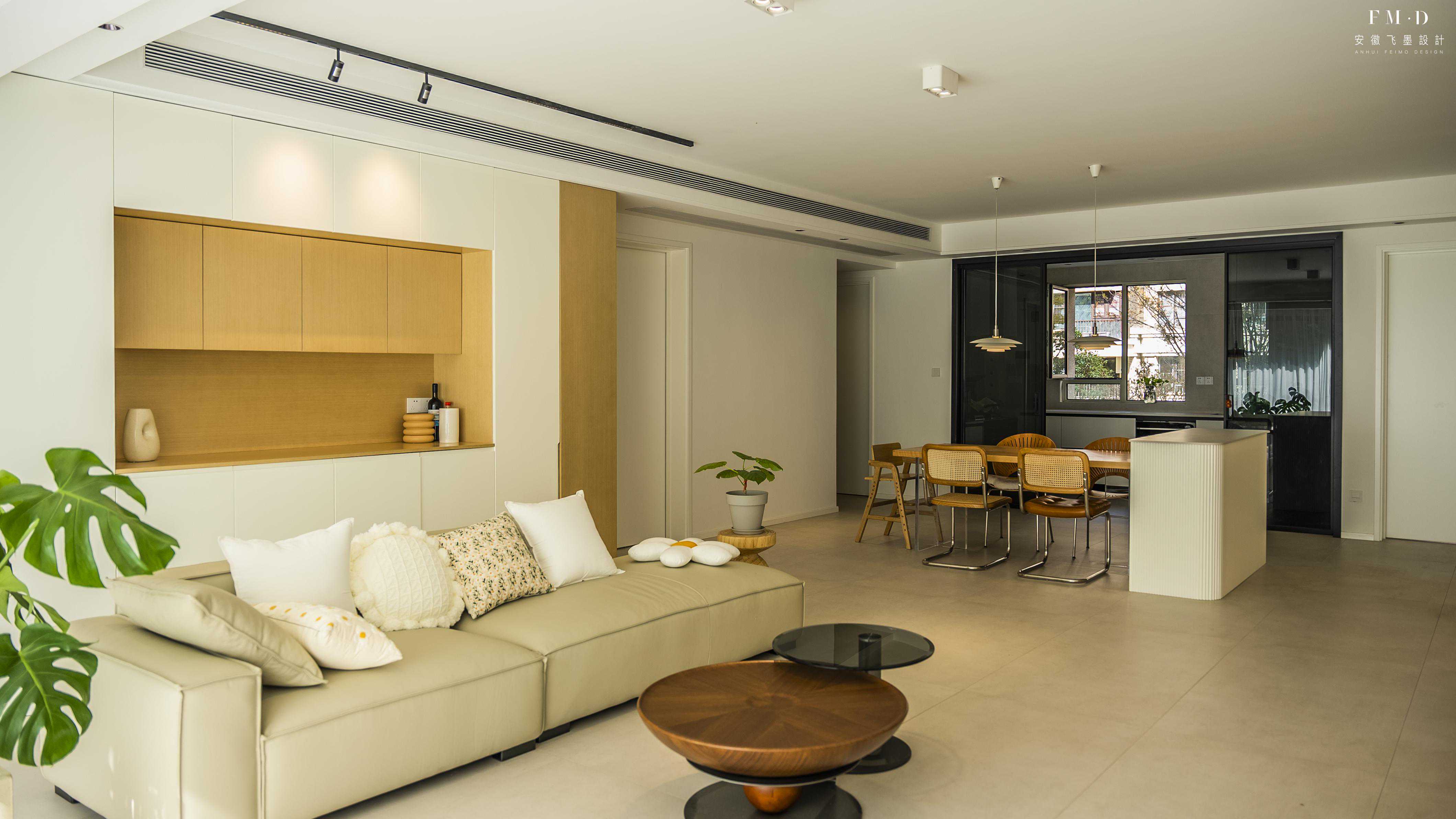 沙发不靠墙,沿墙面定制5.6米长的储物柜,一柜三用,干净又敞亮
