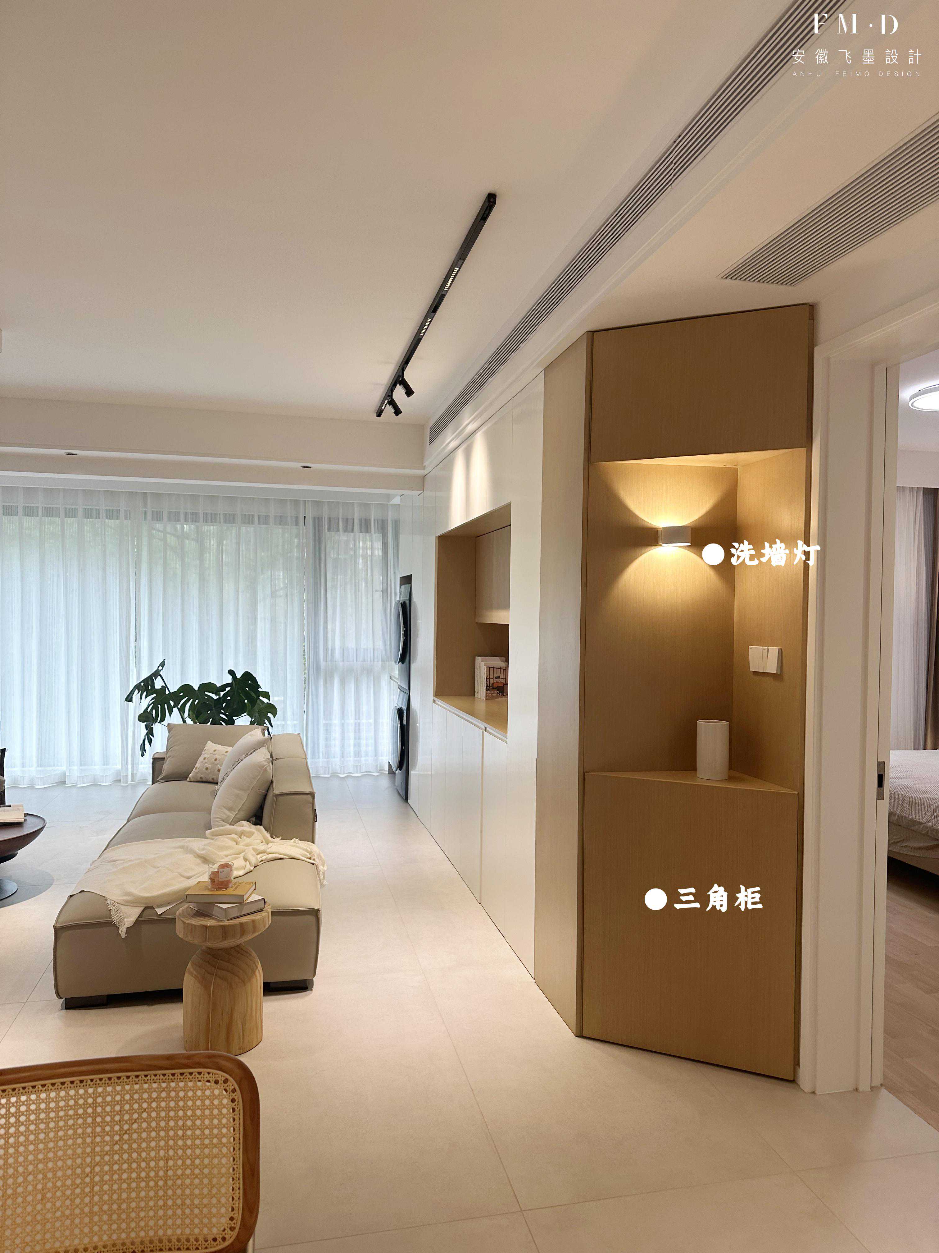 考虑到柜子的右侧靠近卧室门,于是将拐角处改成三角柜,一来可以随手置物,摆放个花瓶,墙上加盏洗墙灯也很有美感。二来能避免进出卧室会碰撞以及带来的压抑感。