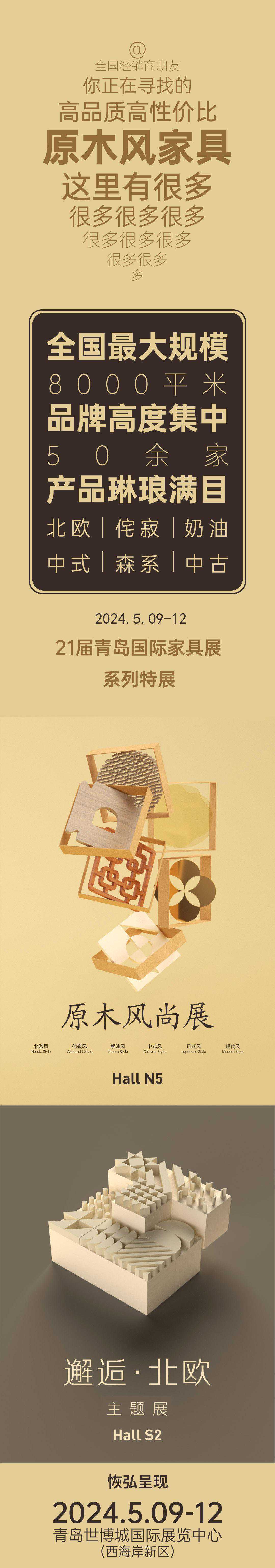 2024年青岛国际家具展立足这一产业优势,对原木风品类进行了整合、优化、升级,重磅打造了“原木风尚展(N5馆)”和“邂逅·北欧主题展(S2馆)”两大特展,共将有50多家品牌参展,展示总面积近8000平米,将以庞大的规模和丰富的产品,掀起一场原木风暴,满足日益增长的市场需求。