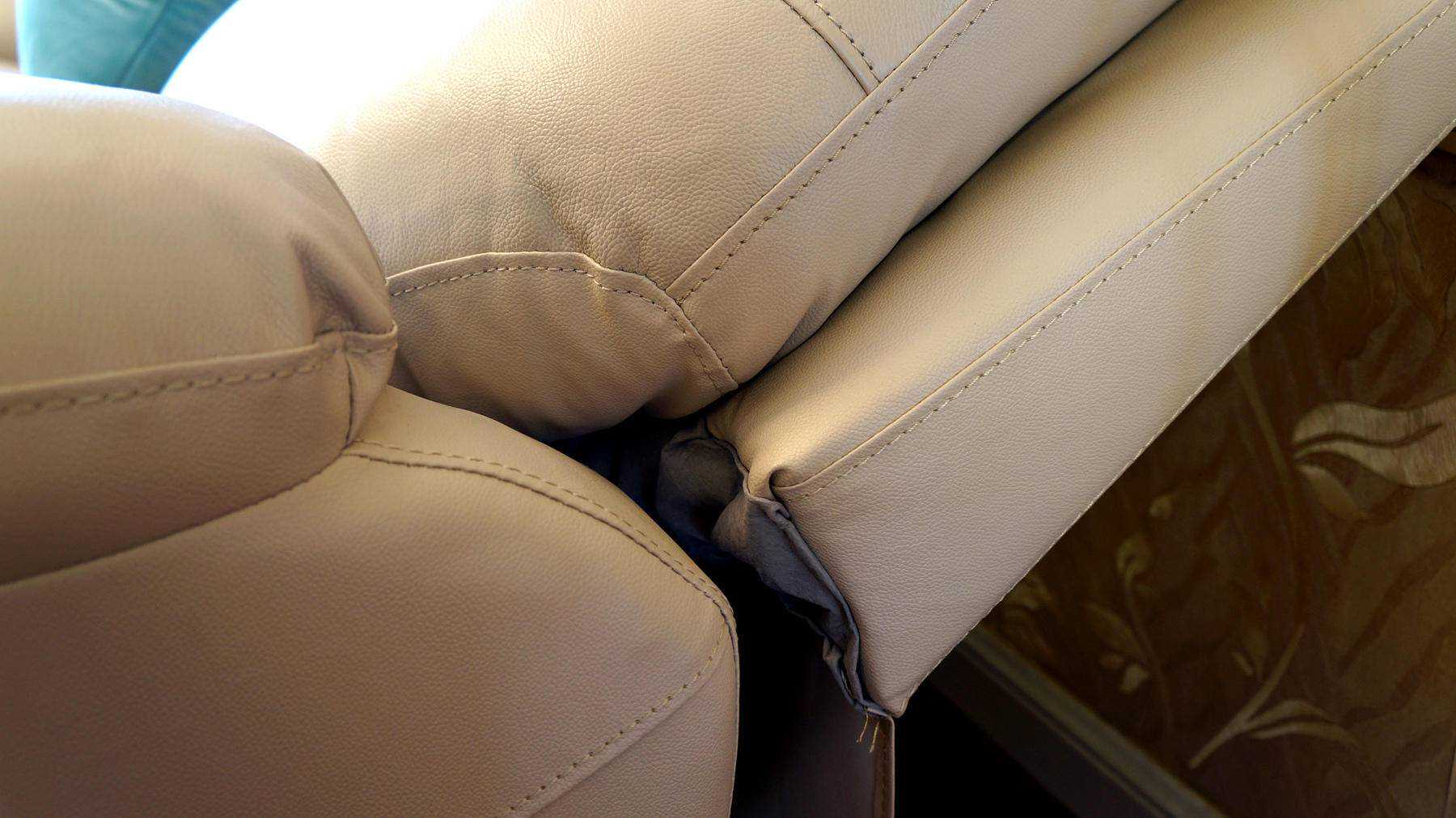 ▲三人位左右两个位置是电动的。中间则不能调。刚运过来皮的味道非常大,坐垫、靠背、两侧手撑、坐垫下沿是真皮。其它则不是